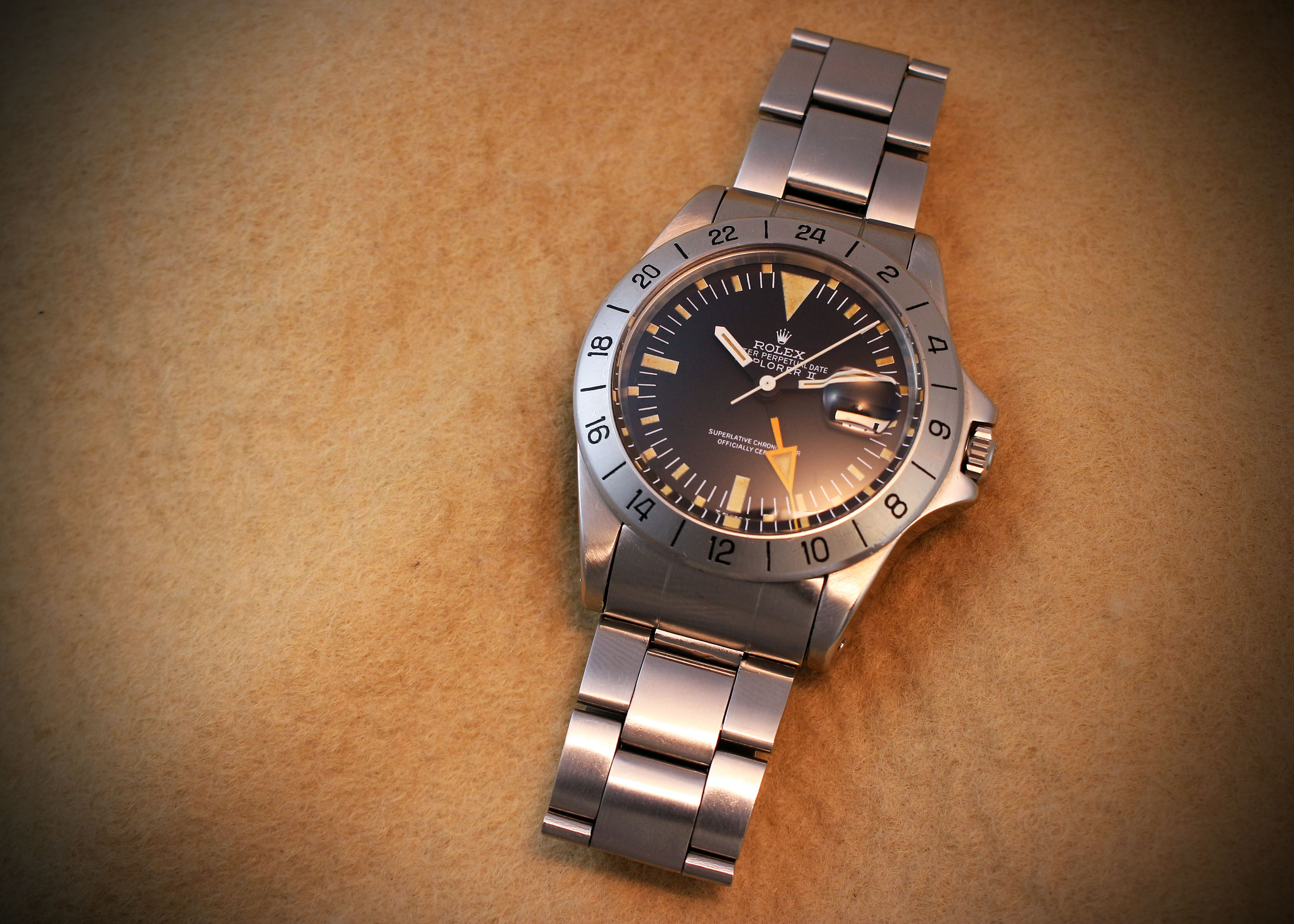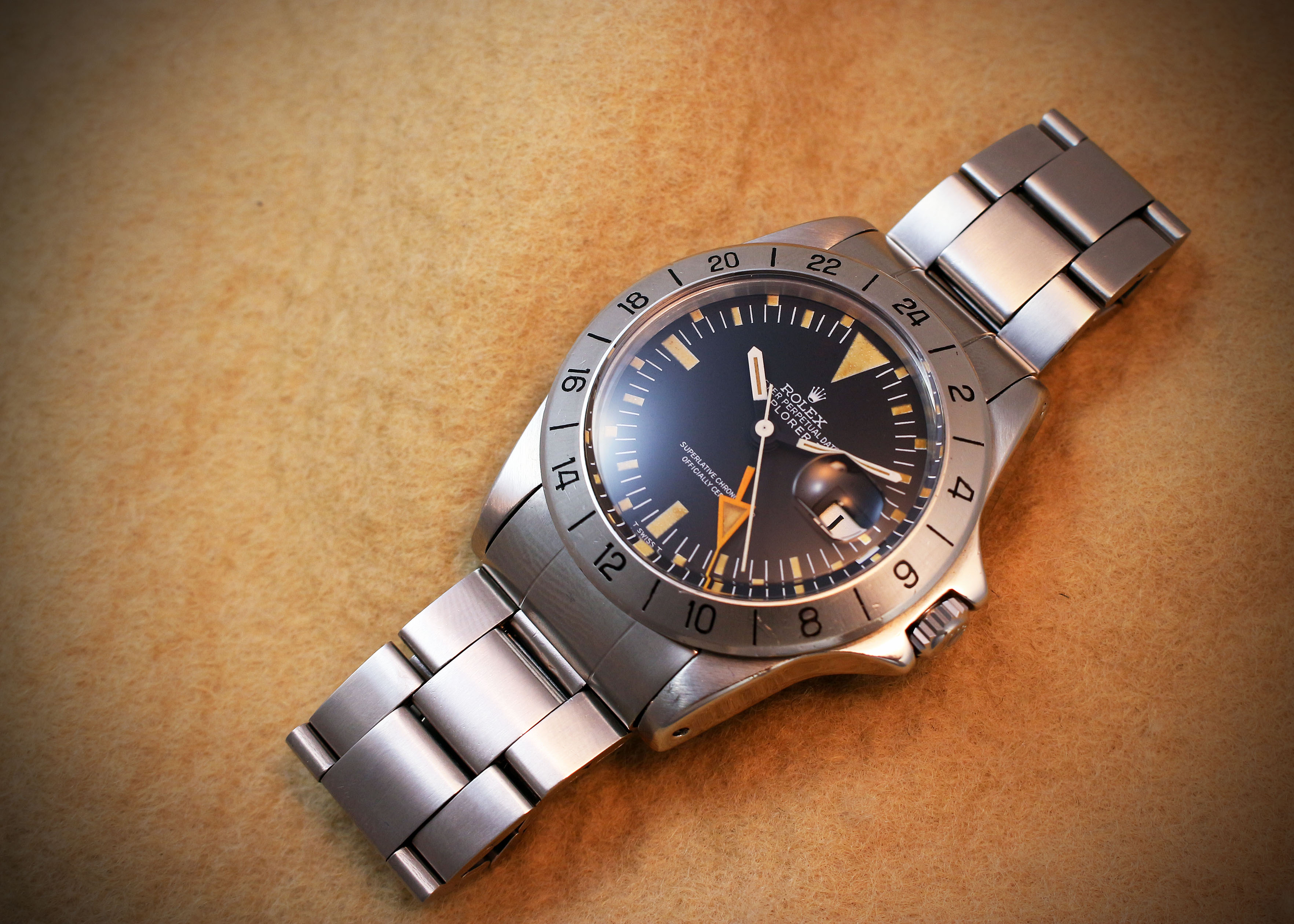 エクスプローラーII REF.1655が入荷して参りました。他のロレックススポーツモデルとは一線を画す斬新なデザインが今見ると新鮮な魅力に満ちています。復刻版モデルが発売された今最も注目度の高くなった時計の一つです。