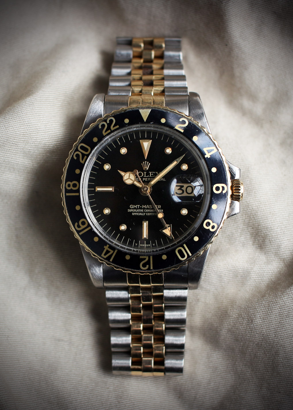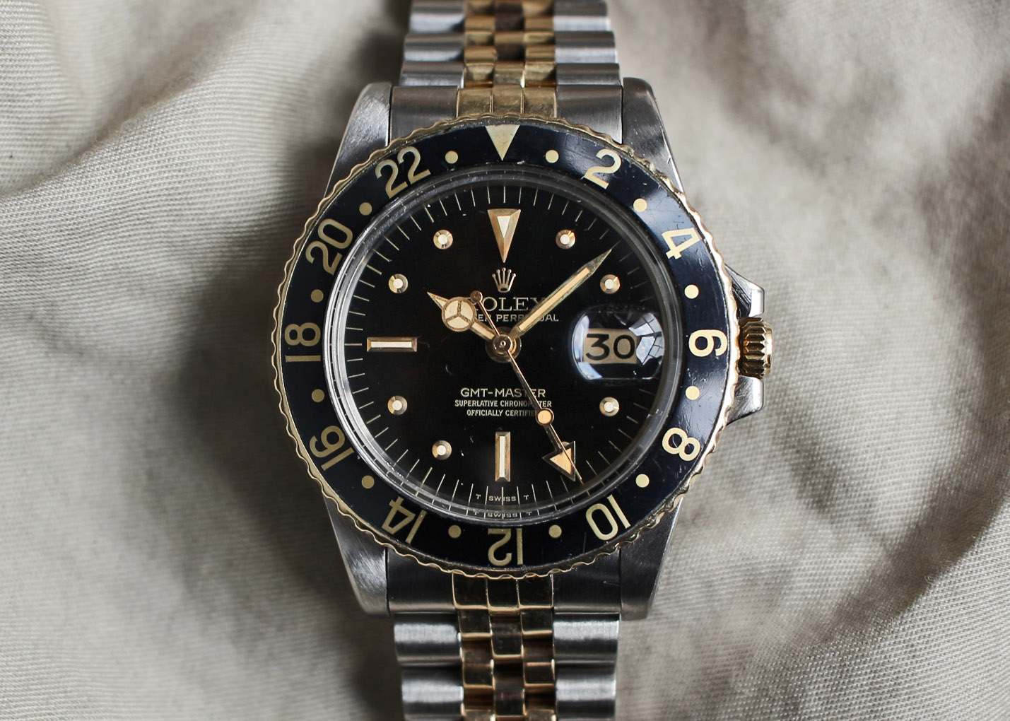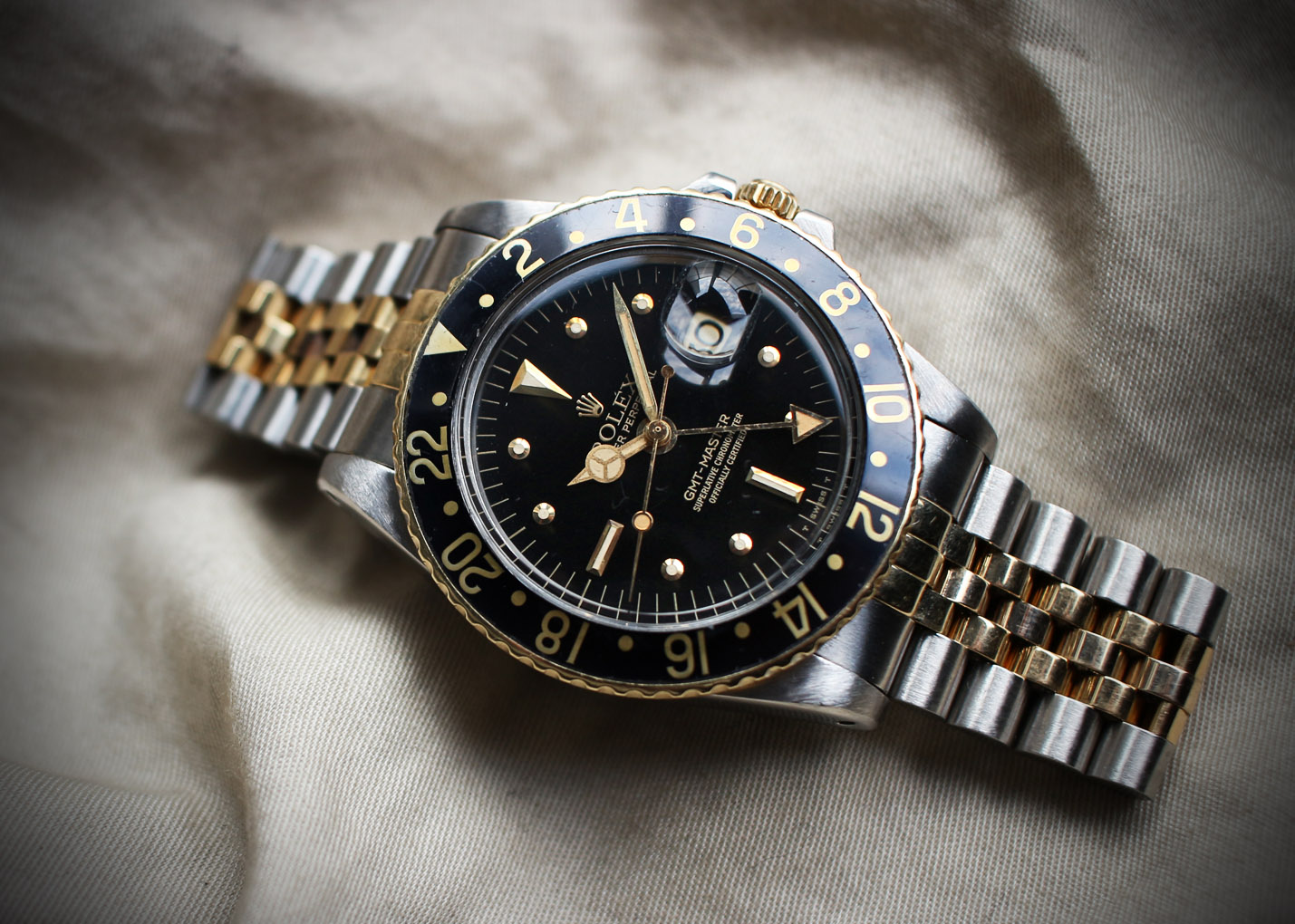 ダイアル、針共にクリーム色に灼けていてブラックベゼルとのバランスが絶妙です。