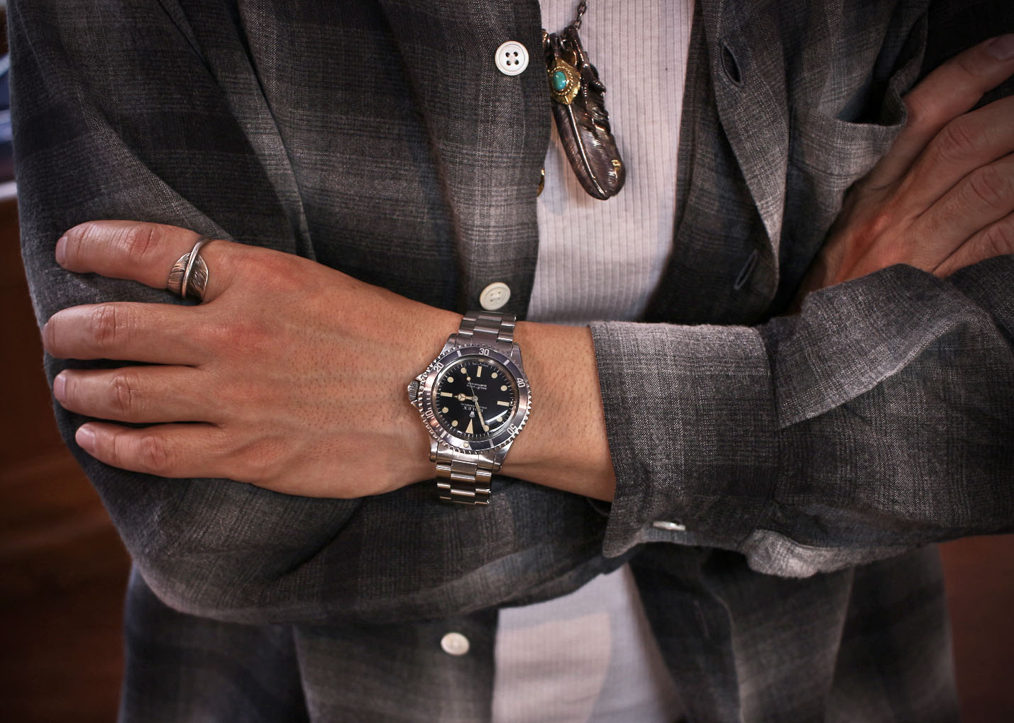 こちらの個体ですがドーム風防越しに見える綺麗にクリーム色からややイエローにに灼けたダイアルインデックスとグレーブルーに退色したベゼルとのバランスが絶妙です。ご購入頂きまして誠に有り難う御座いました、末永くご愛用下さい。