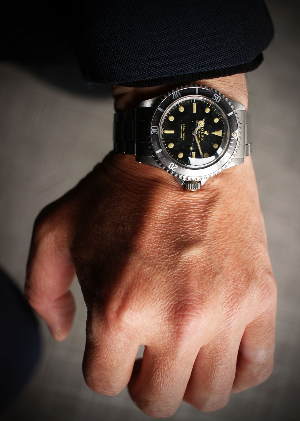 ケースコンディションも良好で伸びの少ない希少なスイス製ロレックス純正リベットブレスが付いている点やサブらしいブルーグレイにエイジングしたベゼルも見所の一つです。